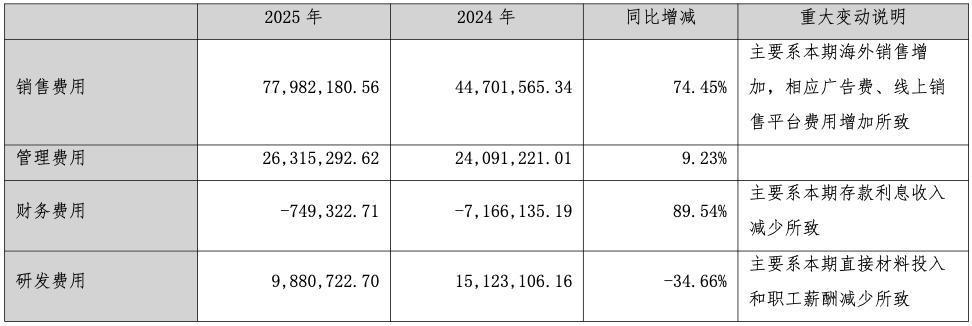 报告期内,公司销售费用同比增长74.45%,主要系本期海外销售增加,相应广告费、线上销售平台费用增加所致。财务费用同比增长89.54%,主要系本期存款利息收入减少所致。研发费用同比减少34.66%,主要系本期直接材料投入和职工薪酬减少所致。